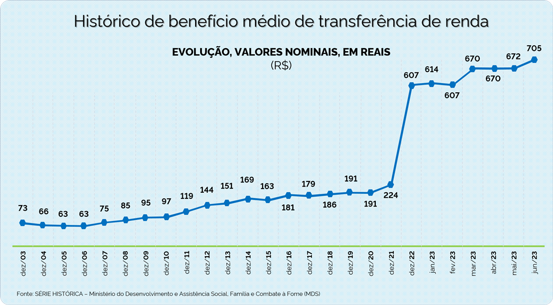 , o novo Bolsa Família atinge em junho toda a sua potencialidade e dois patamares inéditos: pela primeira vez o valor médio do benefício supera a casa dos R$ 700 e chega a R$ 705,40. Os repasses do Governo Federal também são os maiores já realizados: quase R$ 15 bilhões. Os pagamentos têm início nesta segunda, 19/6, para beneficiários com final 1 no Número de Identificação Social (NIS), e seguem até o dia 30.