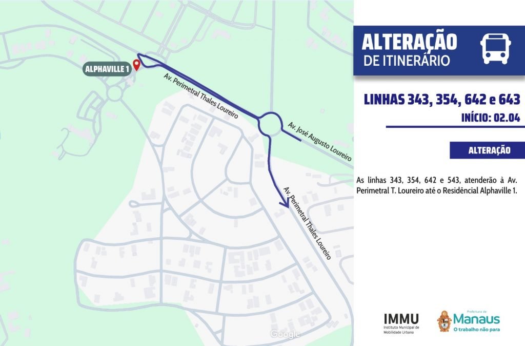 A Prefeitura de Manaus, por meio do Instituto Municipal de Mobilidade Urbana (IMMU), informa que, a partir de quinta-feira, 2/4, haverá alteração no itinerário das linhas de ônibus 343, 354, 642 e 643, na zona Norte da capital.